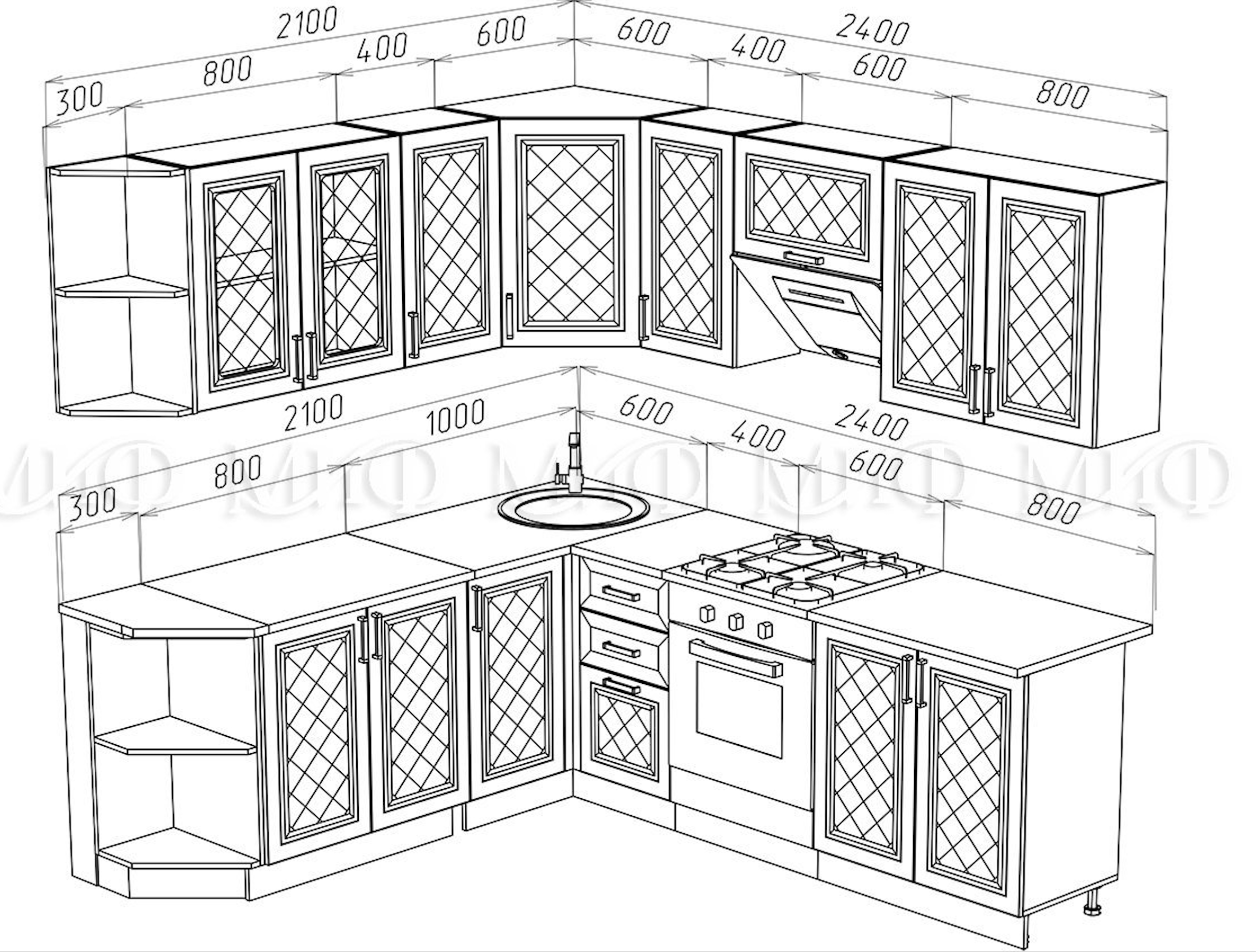 • Глубина шкафов: Верхние 300 мм/Нижние 600 мм/Глубина столешницы 600 мм